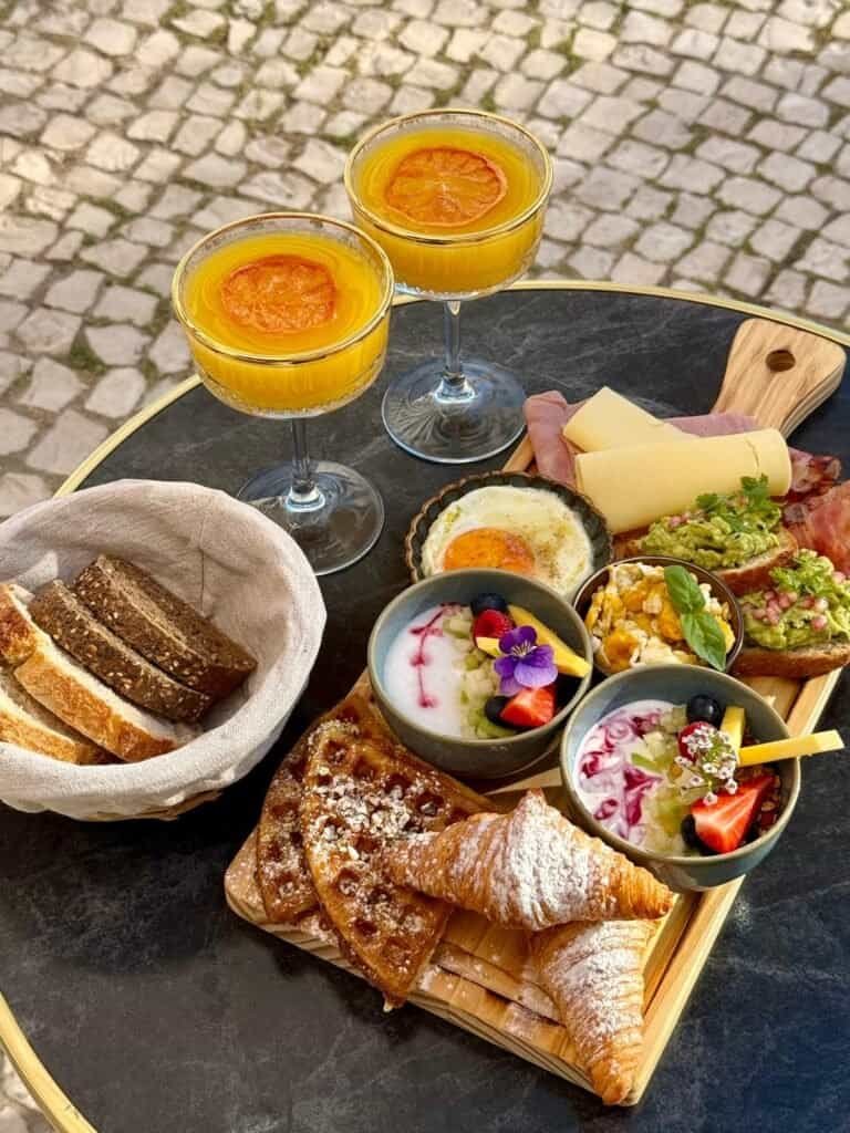 Start your day right with a signature breakfast platter — bread, yogurt, avocado toast, eggs, fruit & Belgian waffles — before heading out to explore the Algarve on one of our premium bikes.